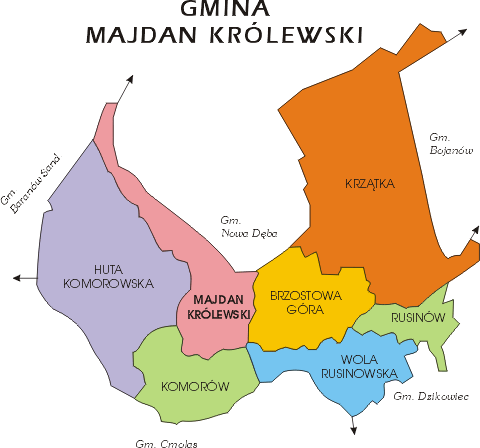 Teren gminy leży na Płaskowyżu Kolbuszowskim (od 220 do 269 m n.p.m.) jako zwarta część Kotliny Sandomierskiej. Zbudowany z utworów mioceńskich powstałych w II połowie okresu trzeciorzędu, które przykrywa warstwa utworów czwartorzędowych. Z bogactw naturalnych należy wymienić żwiry w okolicach Huty Komorowskiej, Majdanu i Krzątki. Również złoża czystego piasku kwarcowego (używanego niegdyś w przemyśle szklarskim). Przeważają gleby bielicowe. Okres wegetacji trwa ponad 220 dni i rozpoczyna się na początku kwietnia. Klimat charakteryzuje się średnio wilgotnością 550 - 600 mm opadów rocznie. Średnia temperatura lipca 18°C, a stycznia -3,5°C. Główną rzeką jest Murynia (lewy dopływ Łęgu), biorąca początek w Komorowie i przepływa przez Majdan, Brzostową Górę, Wolę Rusinowską, Rusinów i Krzątkę. Sieć wodną uzupełniają wewnętrzne potoczki i rzeczki. Największym bogactwem były od wieków lasy Puszczy Sandomierskiej. Współczesny drzewostan jest o wiele uboższy. Głównym gatunkiem w lasach jest sosna, na lepszych glebach występuje jodła z domieszką dębu, buka, graba, brzozy, osiki. Zachowały się resztki parku podworskiego z XIX/XX wieku w Hucie Komorowskiej, w którym sztucznie wprowadzone część gatunków drzew ozdobnych: daglezja, sosna wejmutka, cypryśnik błotny, magnolia, platan klonolistny, sosna Bańka, sosna czarna, z krzewów: bluszcz pospolity, śnieguliczka biała, żywotnik zachodni. Charakterystycznymi przedstawicielami zwierzyny łownej jest: jeleń, sarna, dzik, lis, kuna leśna - tumak (Brzostowa Góra), wilk (lęgowo w Hucie Komorowskiej). Z ptactwa można spotkać: kuropatwy, cietrzew (Huta Komorowska), czaple siwe, bociany białe i czarne, dzikie kaczki, z drapieżnych: jastrzębie, krogulce, kruki i sójki. Gmina Majdan Królewski składa się z 7 sołectw: